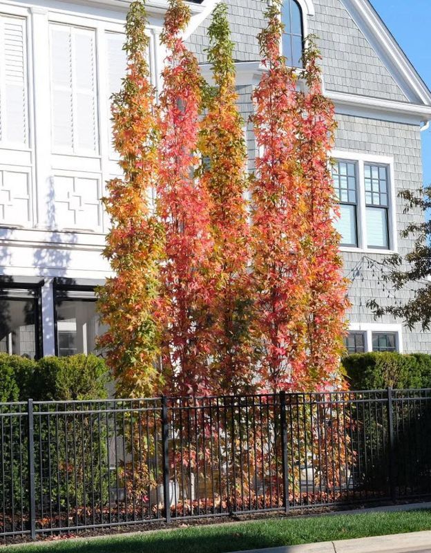 Liquidambar styraciflua 'Slender Silhouette', Ликвидамбар смолоносный 'Слендер Силуэт' другие названия: ликвидамбар американский, амбровое дерево Ликвидамбр известен давно и широко. Декоративные деревья и кусты ликвидамбра можно найти и в холодных регионах, и в местах, где летняя жара достигает 40 градусов. Характерная особенность ликвидамбра - звездчастые листья, из-за которых его можно спутать с кленом. Осенью листья ликвидамбра - настоящее многоцветноя украшение любого сада. Как выглядит и растет Ликвидамбар 'Slender Silhouette' Идеальный выбор для небольшого по площади сада или в городской сад перед домом - Ликвидамбар 'Slender Silhouette'. Растет медленно и преимущественно в высоту, имеет стройную колоновидную форму, очень узкую - при высоте 5м дерево будет иметь в диаметре не более 1м. Листья довольно крупные, рассеченные, с выразительными 5 лопастями, осенью становятся красными, оранжевыми и желтыми. Листья остаются на дереве довольно продолжительное время. Как сажать и ухаживать за Ликвидамбаром 'Slender Silhouette' Высаживать следует в хорошо дренированные почвы, умеренно плодородные, не заболоченные, кислые. После укоренения ликвидамбар 'Slender Silhouette' выдержит как засуху, так и заболачивание. Но для получения более густой кроны советуем применить мульчирование в течение всего года. Если при посадке саженец имеет высоту 1,5 м и выше, советуем течение 1-3 лет использовать подпор (3-Колышковый или 1-Колышковый косой) - это позволит избежать негативного воздействия ветра на укоренение. Для формирования кроны можно проводить обрезку в конце зимы. Морозостойкость до -27°C. Где сажать Ликвидамбар 'Slender Silhouette' Ликвидамбар 'Slender Silhouette', благодаря компактным размерам, украсит даже небольшие по площади сады. Городские дворы перед домами, парки, аллеи, дорожки. Это замечательный колористический акцент для любого ландшафта.