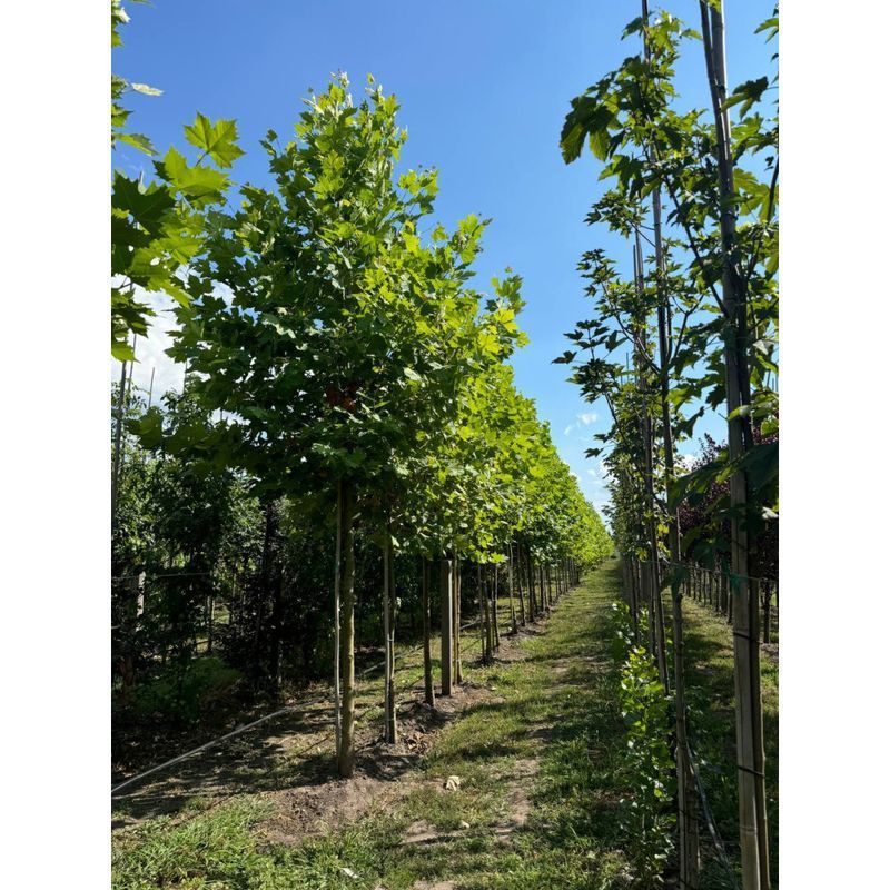 Platanus x acerifolia, Платан Лондонський - це могутнє, велике, листяне, морозостійке дерево з широкою, розкидистою кроною. Висаджувати можна в алеї та парки або в одиночних насадженнях. Добре переносить стрижки і підходить для формування крони. Купити Платан гібридний (кленолистий) вкорінений саджанець або з кореневим коммо від українського виробника з доставкою по Україні. Одна з назв платана кленолистого - london plane, адже він став домінантою вулиць столиці Британії. Могутні дерева, які добре витримують агресивне міське середовище та забруднення. Походження платану кленолистого невідоме, але, вважається, що це гібрид Платана західного (platanus occidentalis) та Платана східного (platanus orientalis). Як виглядає і росте Платан кленолистий: Платан кленолистий - прекрасне дерево для парків, але його можна висаджувати і на менших за площею ділянках, за умови контролю розмірів нечастою обрізкою. Дуже ефектна декоративна особливість платану кленолистого - у старших дерев кора лущиться, формуючи "килим" на стовбурі з різних за кольором ділянок - сірих, зелених, коричневих і кремових. Особливо вражаюче це виглядає взимку, коли листя вже не закриває гілки та стовбур. В дорослому віці платан може досягати 20-30м заввишки та 10-15 м в діаметрі. У молодих дерев темпи росту досить високі - до 1м на рік.